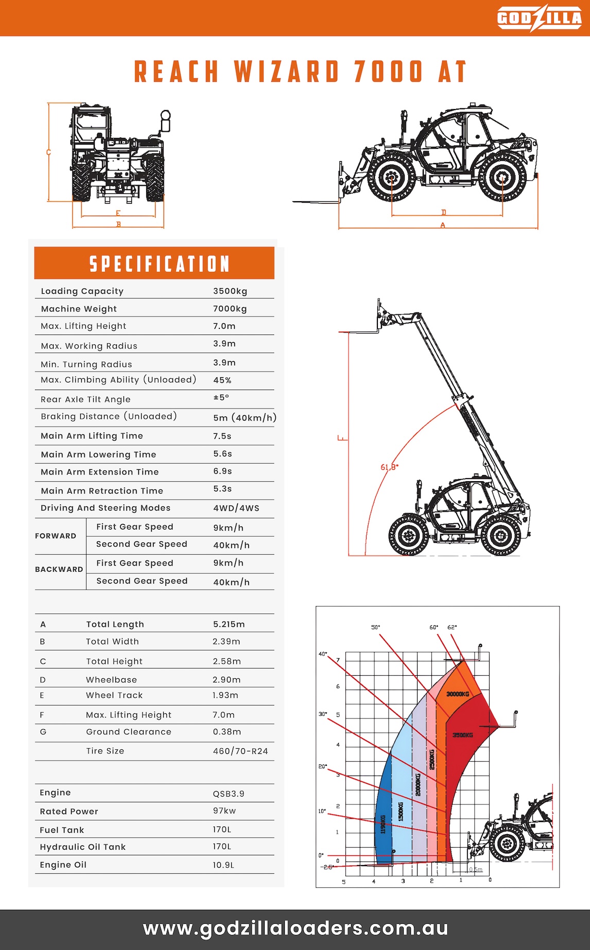 With a rated capacity of 3,500kg and maximum lift height of 7.0 metres, it delivers excellent performance for stacking pallets, lifting roof trusses, loading trucks and handling bulk materials.