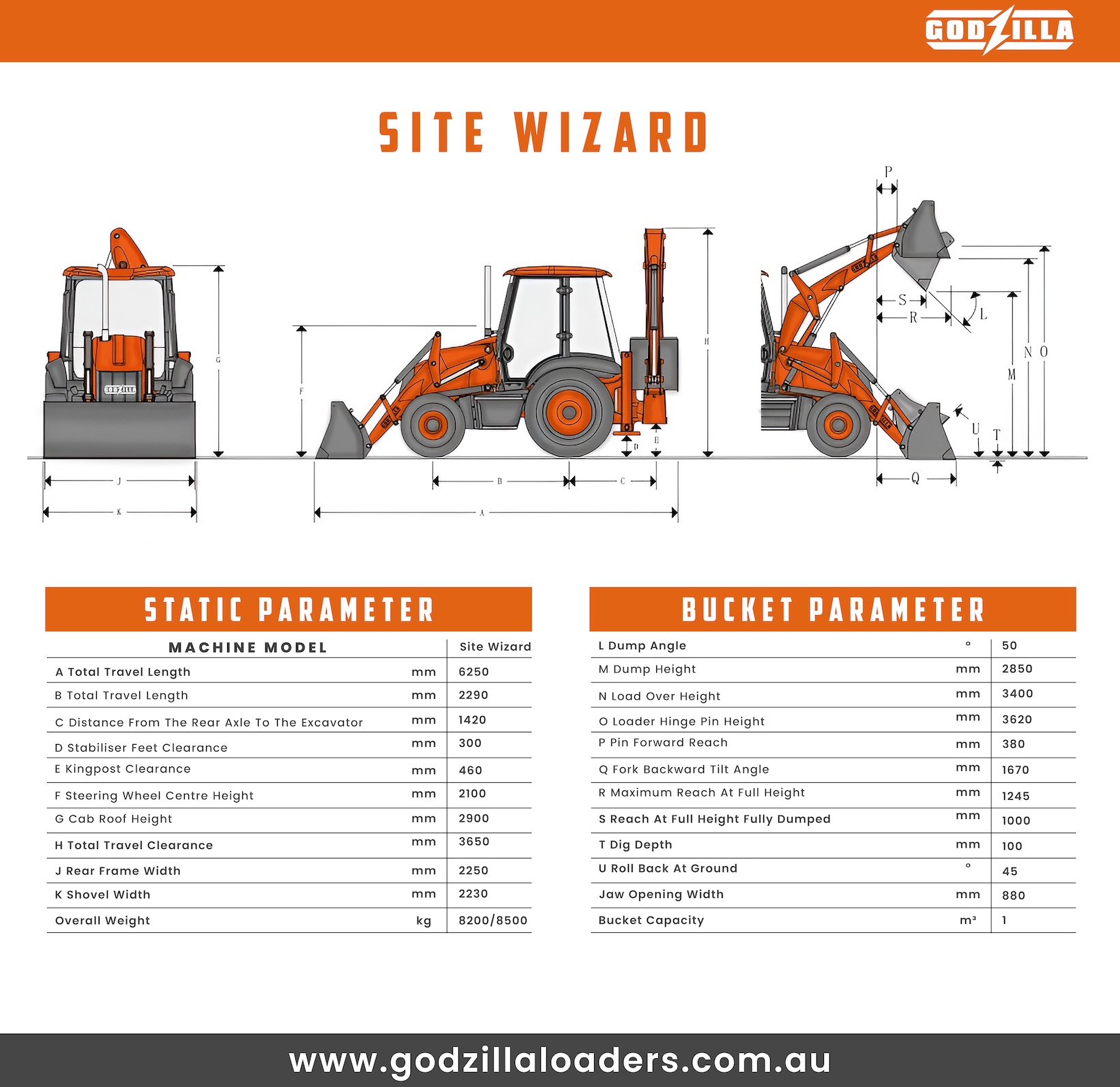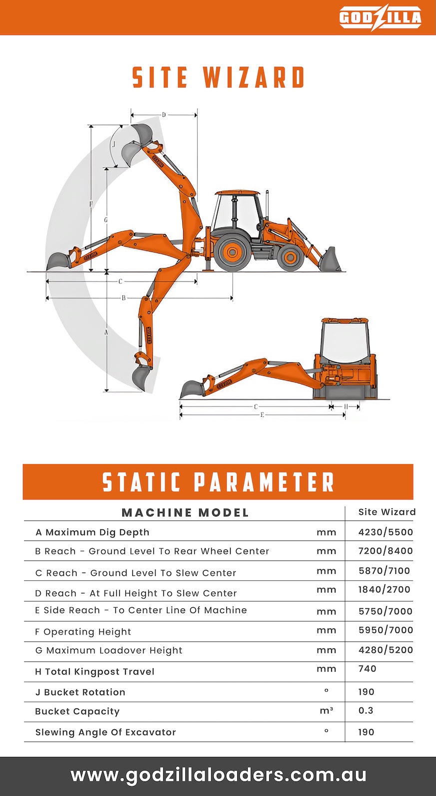 The Godzilla Site Wizard is a heavy-duty 8.2 tonne backhoe loader designed for serious earthmoving, trenching and material handling applications. Combining a powerful front loader with a high-performance rear excavator arm, it delivers the versatility contractors expect — without the premium brand price tag.
